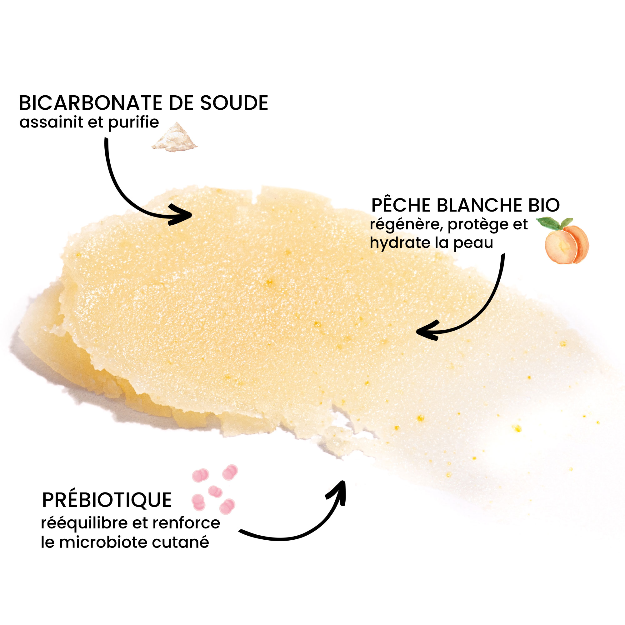 To intensify the absorbency of our deodorant, we've added baking soda. A white powder derived from a mineral, it is widely appreciated for its absorbent properties. It is also recognized for its antimicrobial action, fighting the bacteria responsible for unpleasant odors. In its pure state, its alkaline pH can be irritating to underarms, but we've adjusted the formula to reduce the pH, ensuring better compatibility with the skin and minimizing the risk of irritation.