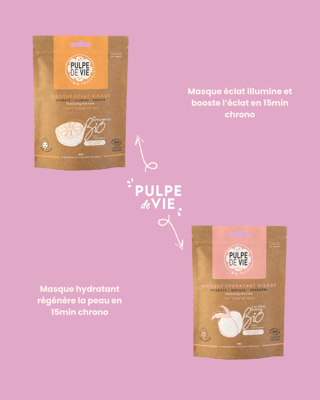 Illumine et hydrate la peau avec les masques en tissu éclat et hydratant, enrichis en eaux de fruits BIO, vitamine C et extraits de pêche BIO pour un teint frais, souple et lumineux.