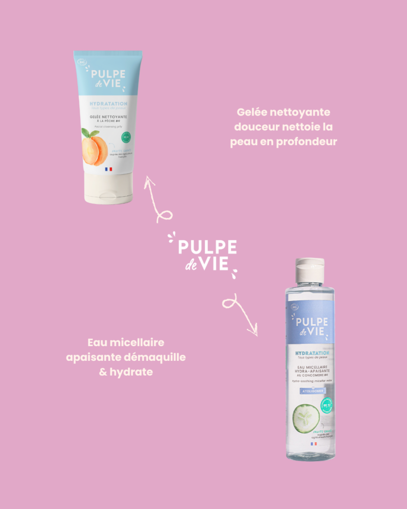 Nettoie et démaquille la peau en douceur grâce à la gelée nettoyante et à l’eau micellaire, formulées avec des agents doux et des eaux florales BIO pour préserver l’hydratation et le confort cutané.